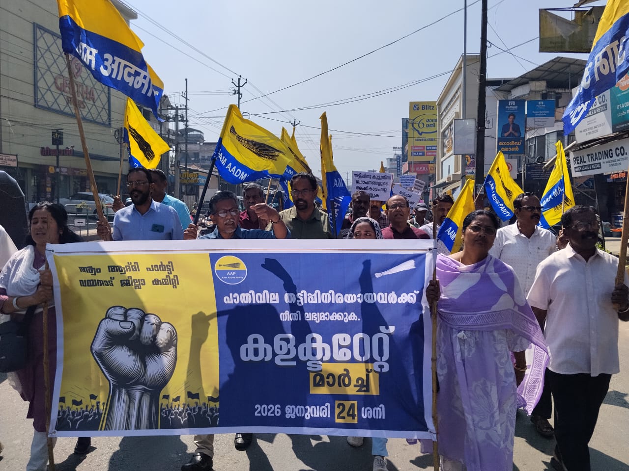 കൽപ്പറ്റ: പാതിവില സാമ്പത്തിക തട്ടിപ്പുമായി ബന്ധപ്പെട്ട് അന്വേഷണം വേഗത്തിൽ പൂർത്തിയാക്കി ഇരകൾക്ക് നഷ്ടപ്പെട്ട പണം തിരികെ നൽകാനും തട്ടിപ്പിന് കൂട്ട് നിന്ന സ്ഥാപനങ്ങളുടെ അംഗീകാരം റദ്ദ് ചെയ്യുക എന്ന് ആവശ്യപ്പെട്ട് ആം ആദ്മി പാർട്ടി കലക്ട്രേറ്റ് മാർച്ച് സംഘടിപ്പിച്ചു. സംസ്ഥാന ആക്ഷൻ കൗൺസിൽ കോർഡിനേറ്റർ അഡ്വ ബേസിൽ ജോൺ ഇടുക്കി ഉദ്ഘാടനം ചെയ്തു. തട്ടിപ്പിലൂടെ പങ്ക് പറ്റിയ ജന പ്രതിനിധികളുടെയും മുഖ്യധാരാ രാഷ്ട്രീയ പാർട്ടികളുടെയും മൗനം കേരളത്തിലെ ഇരകളോടുള്ള വഞ്ചനയാണെന്ന് അദ്ദേഹം കുറ്റപ്പെടുത്തി. അന്വേഷണം വേഗത്തിൽ പൂർത്തിയാക്കി ഇരകളോട് നീതി പുലർത്തണമെന്നും അദ്ദേഹം ആവശ്യപ്പെട്ടു. നൂറ് കണക്കിന് ഇരകൾ പങ്കെടുത്ത കലക്ടറേറ്റ് മാർചിൽ പാർട്ടി സംസ്ഥാന വൈ. പ്രസിഡണ്ട് അജി കൊളോണിയ മുഖ്യ പ്രഭാഷണം നടത്തി. ജില്ലാ പ്രസിഡണ്ട് ഡോ എ ടി സുരേഷ് അധ്യക്ഷത വഹിച്ചു. ജില്ലാ കമ്മിറ്റിയുടെ നേതൃത്വത്തിൽ ജില്ലാ കലക്ടർ, ജില്ലാ പോലീസ് മേധാവി എന്നിവർക്ക് മാസ് പെറ്റീഷൻ നൽകുകയും ഇരകൾക്ക് നീതി ഉറപ്പ് വരുത്താൻ നടപടികൾ വേഗത്തിൽ പൂർത്തിയാക്കണമെന്നും ആവശ്യപ്പെട്ടു. ജില്ലാ, മണ്ഡലം ഭാരവാഹികളായ പോൾസൺ കെ.എം, റഫീക്ക് കമ്പളക്കാട്, ലിയോ മാത്യു, ജയിംസ് കൊമ്മയാട്, ഷെറിൻ റോയ്,സൽമാൻ എൻ റിപ്പൺ, തുടങ്ങിയ പ്രവർത്തകർ നേതൃത്വം നൽകി.