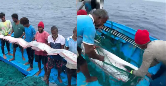 കടലിന്റെ അടിത്തട്ടിൽ കഴിയുന്ന ഓർ മത്സ്യത്തെ തമിഴ്നാട് തീരത്ത് കണ്ടെത്തി. വെള്ളിനിറത്തിൽ റിബൺ പോലെ ശരീരമുള്ള മത്സ്യത്തിന് 30 അടിയോളം നീളമുണ്ടായിരുന്നു. സമുദ്രോപരിതലത്തിലെത്തിയ ഓർ മത്സ്യം മത്സ്യത്തൊഴിലാളികളുടെ വലയിൽ കുടുങ്ങുകയായിരുന്നു. സംഭവത്തിന്റെ വിഡിയോ സമൂഹമാധ്യമങ്ങളിൽ വൈറലാണ്.