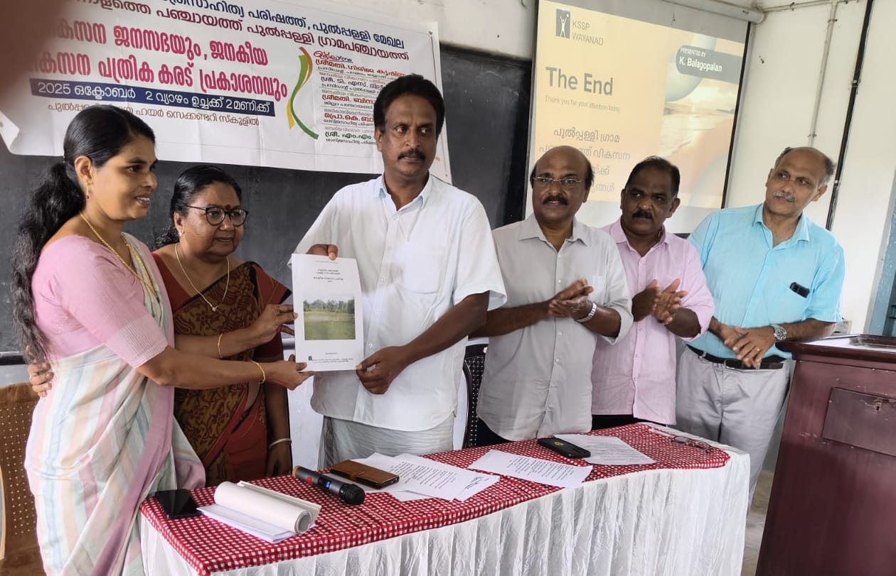 പുൽപ്പള്ളി : കേരള ശാസ്ത്ര സാഹിത്യ പരിഷത്ത് തയ്യാറാക്കിയ പുല്പള്ളി ഗ്രാമ പഞ്ചായത്ത് ജനകീയ വികസന പത്രിക ഗ്രമപഞ്ചായത്ത്പ്രസിഡന്റ് ടി.എസ് ദിലീപ്കുമാർ ജില്ലാ പഞ്ചായത്തംഗം ബിന്ദു പ്രകാശിനു നല്കി ജനസഭ ഉദ്ഘാടനം ചെയ്യുന്നു.ഗ്രാമപഞ്ചയത്ത് അംഗം ഉഷ ബേബി പ്രൊഫ.കെ ബാലഗോപാലൻ , സി.എം. ജോസഫ് ,എം.എം. ടോമി എന്നിവർ സമീപം.