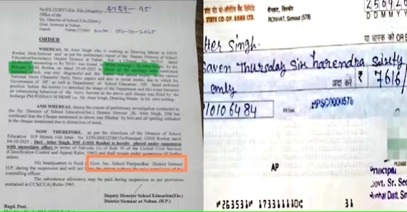 ഹിമാചലിലെ സിർമൗറിലെ റോൺഹട്ടിലുള്ള ഗവ. സീനിയർ സെക്കൻഡറി സ്കൂളിലെ ഡ്രോയിങ് അധ്യാപകൻ അട്ടർ സിങ്ങിനെയാണ് വിദ്യാഭ്യാസ വകുപ്പ് അക്ഷരത്തെറ്റിന് ശിക്ഷിച്ചത്. അധ്യാപകന്റെ പേരിലുള്ള അക്ഷരത്തെറ്റുകൾ നിറഞ്ഞ ചെക്ക് സമൂഹമാധ്യമങ്ങളിൽ വൈറലായിരുന്നു. ചെക്കിലെ തുക കൃത്യമായി അക്കത്തിൽ എഴുതിയിട്ടുണ്ടെങ്കിലും, ഇംഗ്ലിഷിൽ വാക്കുകളായി എഴുതിയപ്പോൾ ആകെ തെറ്റി. 7616 എന്നത് ‘സെവൻ തൗസൻഡ് സിക്സ് ഹൻഡ്രഡ് ആൻഡ് സിക്സ്റ്റീൻ’ എന്നെഴുതേണ്ടതിന് പകരം ‘Saven Thursday six Harendra sixty rupees only’ എന്നായിരുന്നു ചെക്കിൽ എഴുതിയത്.
