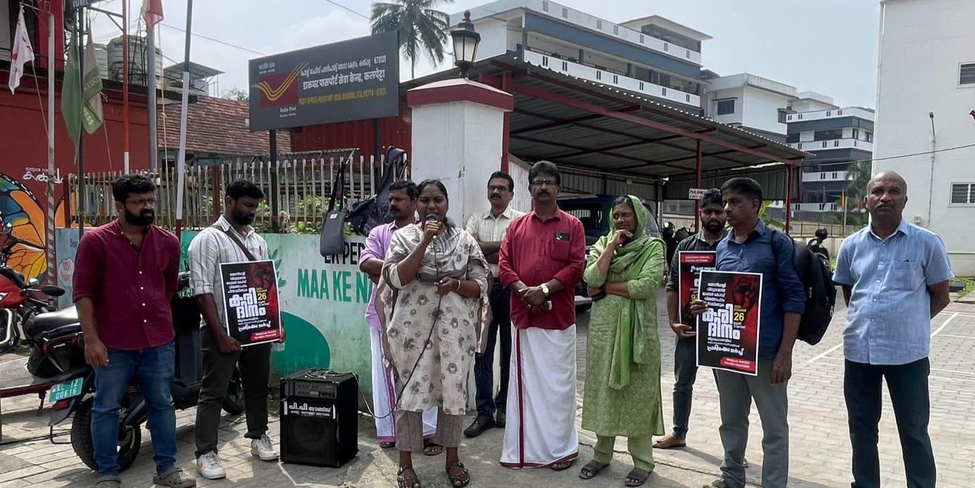 കൽപ്പറ്റ : തൊഴിലവകാശങ്ങൾ ഇല്ലാതാക്കുന്ന, തൊഴിൽ സുരക്ഷിതത്വം കവർന്നെടുക്കുന്ന, സംഘടിക്കുന്നതിനും പ്രതിഷേധിക്കുന്നതിനുമുള്ള ഭരണഘടനാപരമായ അവകാശം ഹനിക്കുന്ന കേന്ദ്ര സർക്കാരിൻ്റെ തൊഴിലാളി വിരുദ്ധ ലേബർ കോഡുകൾക്കെതിരെ അധ്യാപക സർവീസ് സംഘടന സമരസമിതിയുടെ നേതൃത്വത്തിൽ കൽപ്പറ്റ പോസ്റ്റ് ഓഫീസിനു മുന്നിൽ പ്രതിഷേധ ധർണ്ണ സംഘടിപ്പിച്ചു. ജോയിൻ്റ് കൗൺസിൽ സംസ്ഥാന സെക്രട്ടേറിയറ്റ് അംഗം അജിത കെ. കരിദിനാചരണവും ധർണ്ണ സമരവും ഉദ്ഘാടനം ചെയ്തു.
