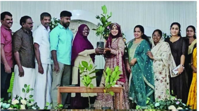 കക്കിടിപ്പുറം കെസിസി ഓഡിറ്റോറിയത്തിൽ നടന്ന ചടങ്ങിൽ നവവ ധുവിന് തൈകൾ സമ്മാനിച്ച് ആലംകോട് ഗ്രാമപഞ്ചാ യത്ത് പ്രസിഡന്റ്റ് ആസ്യ ഇബ്രാഹിം ആണ് വേറിട്ടൊരു ഉദ്യമത്തിന് തുടക്കമിട്ടത്.കഴിഞ്ഞ പത്തു വർഷത്തോളമായി മരമുറി തൊഴിലാളി യായ ഹംസ ഇതിനോടകം നിരവധി മരങ്ങൾ മുറിച്ച് മാ റ്റിയിട്ടുണ്ട്.ജോലിയുടെ ഭാഗമാണെങ്കിലും മരങ്ങൾ മുറിച്ചുമാറ്റുന്ന ത് പലപ്പോഴും പ്രയാസം സൃഷ്ടിച്ചിരുന്നുവെന്നും അതി നാലാണ് മകളുടെ വിവാഹദിനത്തിൽ ഫലവൃക്ഷതൈ കൾ സൗജന്യമായി എല്ലാവർക്കും നൽകിയതെന്നും ഹംസ പറഞ്ഞു.തൊഴിലിനിടെ ഏറ്റവും കൂടുതൽ മുറിക്കേണ്ടി വന്ന പ്ലാ വ്, മട്ടി, മാവ് തുടങ്ങിയ മരങ്ങളാണ്. അതിനാൽ ഈ വി ഭാഗത്തിലെ വിവിധ ഇനം ഹൈബ്രീഡ് തൈകളാണ് ഹം സ 1500ലേറെ പേർക്ക് നൽകിയത്.